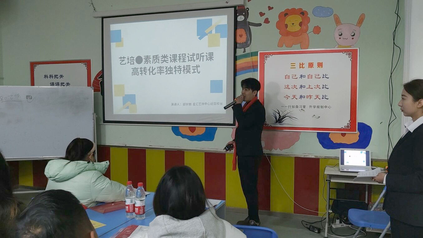 由星匯藝體中心運營校長郭宇麟老師分享了素質類課程試聽轉化率提升的獨特模式。郭老師詳細闡述了如何通過精心設計的課程內容和教學方法,有效吸引學生和家長,提高試聽課程的轉化率。此外,他還就如何利用抖音等新媒體平臺,拓展藝培新時代的市場進行了精彩的分享。