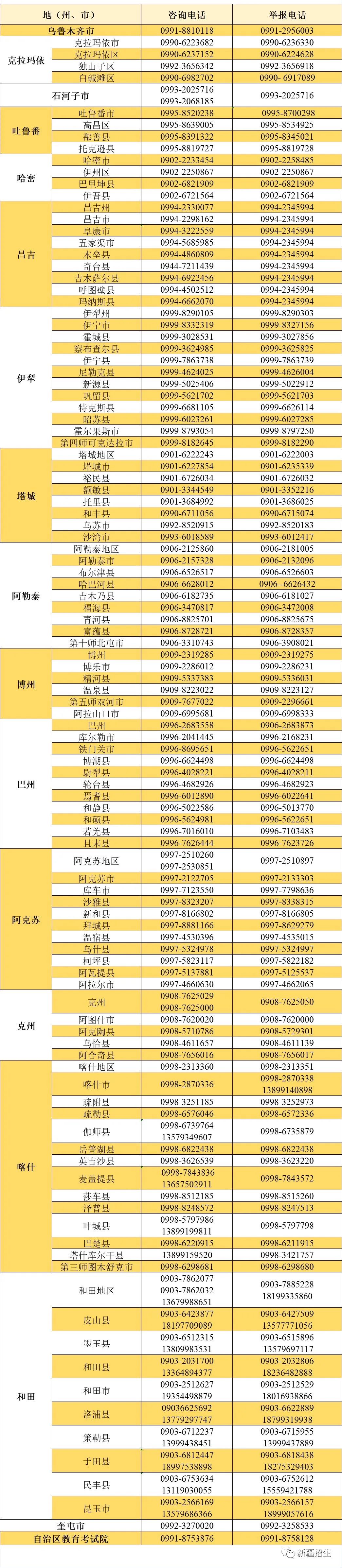 考生可登錄“新疆招生網”查看《關于印發〈自治區2023年普通高等學校招生體育類專業測試工作方案〉的通知》,詳細了解我區2023年普通高等學校招生體育類專業測試報考條件及相關要求,按時按要求完成網上報名。考生如有疑問,可撥打當地教育考試機構咨詢電話(詳見下表)咨詢。